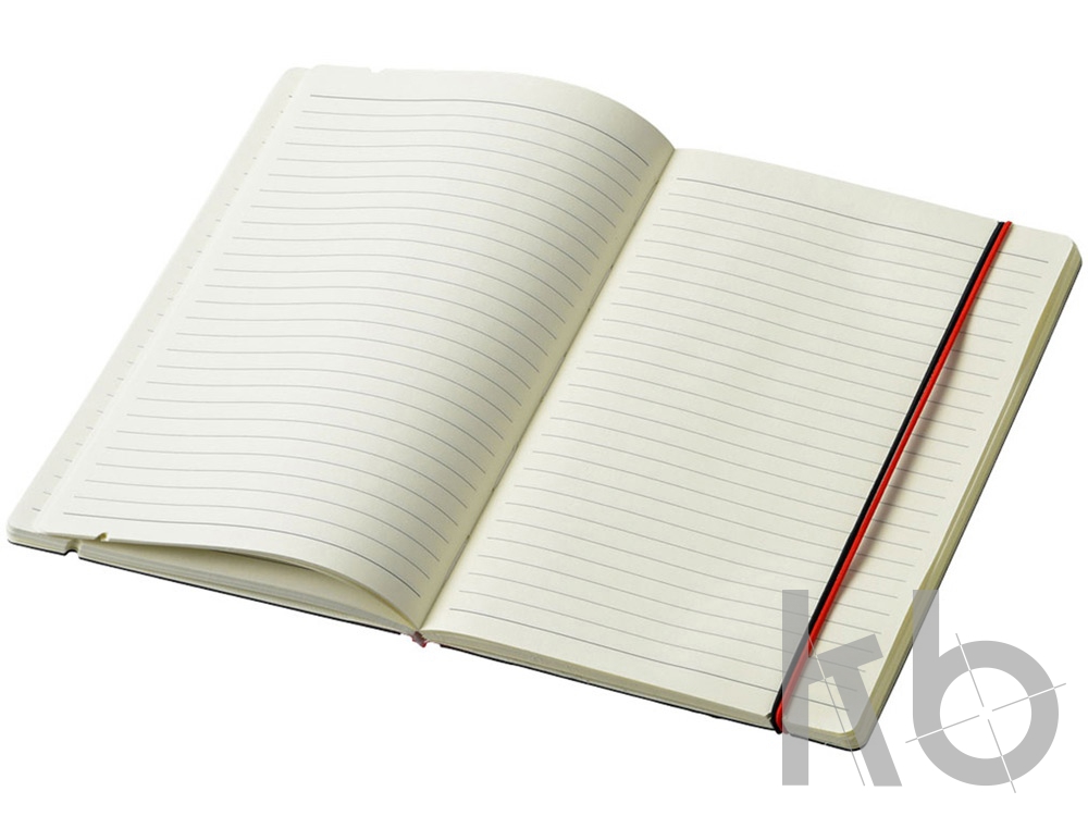 Блокнот Cuppia. Цветной корешок и эластичная застежка подчеркивают стиль этого классического эксклюзивного блокнота с черной твердой обложкой (размера A5) и его индивидуальность. Эластичная петелька для ручки на корешке предназначена для дополнительного удобства. Блокнот содержит 80 листов линованной бумаги (80 г/м²). Предлагается в подарочной коробке-рукав Journalbooks. Картон.