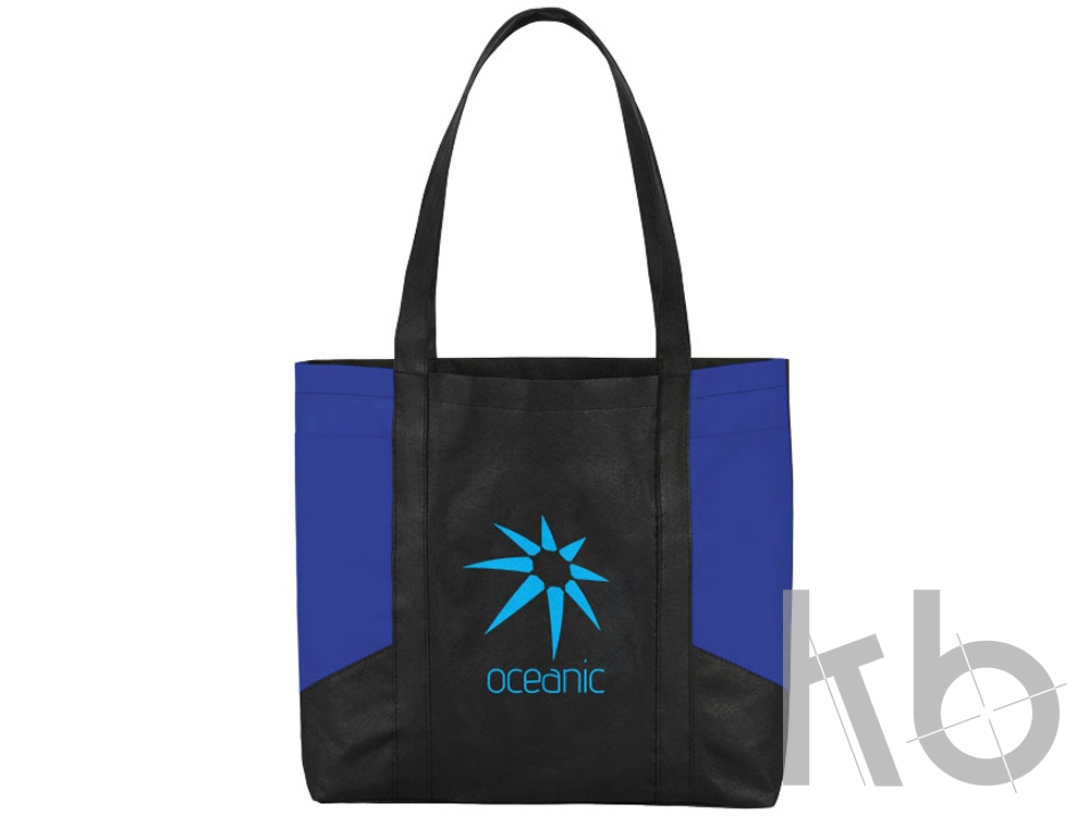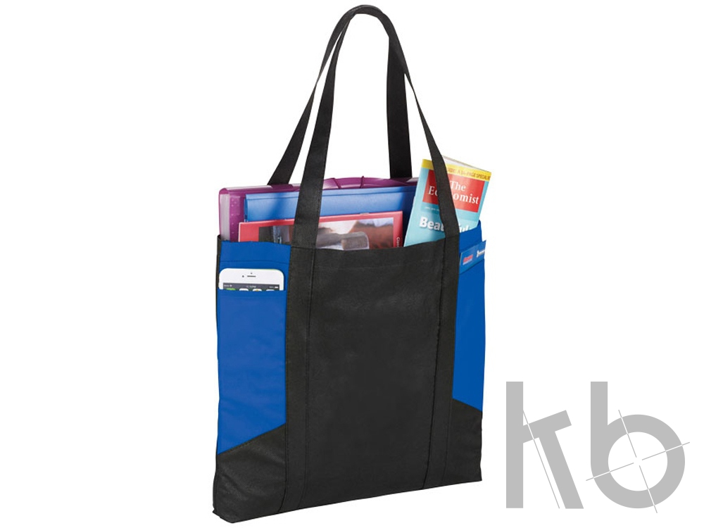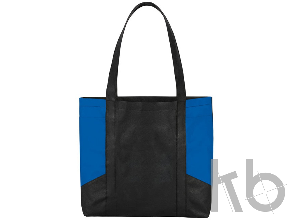 Сумка с цветными панелями. Сумка для покупок с открытым основным отделением и привлекательными горизонтальными цветными панелями с обоих сторон. Два боковых кармана для дополнительного места. Высота ручек 29 см. 100г полипропилен.