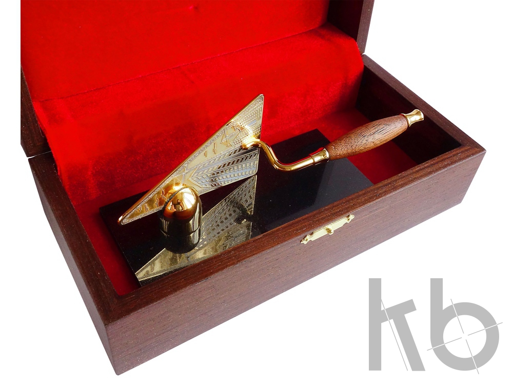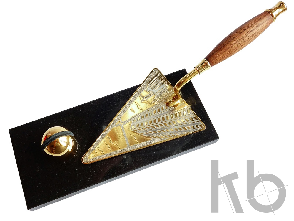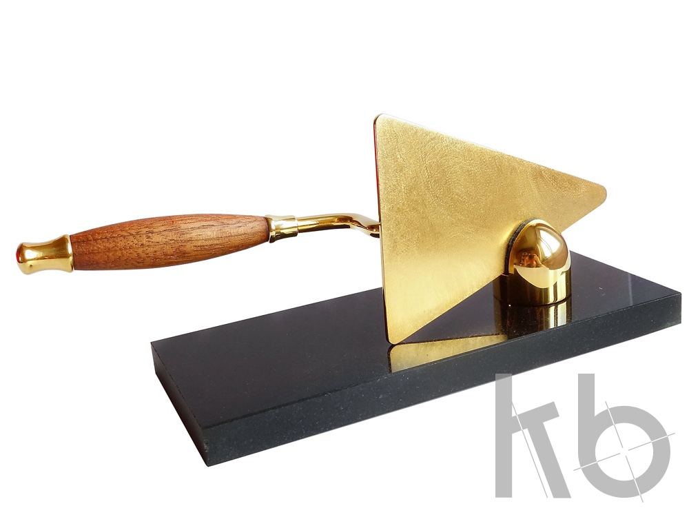 Оригинальный статусный подарок в виде строительного мастерка. Станет приятным подарком для руководителя строительной компании или презентом на новоселье. Подставка статуэтки выполнена из долерита - удивительно прочного и стильного материала. Сам мастерок изготовлен из латуни с золотым и никелированным покрытием. Настольный прибор упакован в коробку из дерева со стильным матовым покрытием.