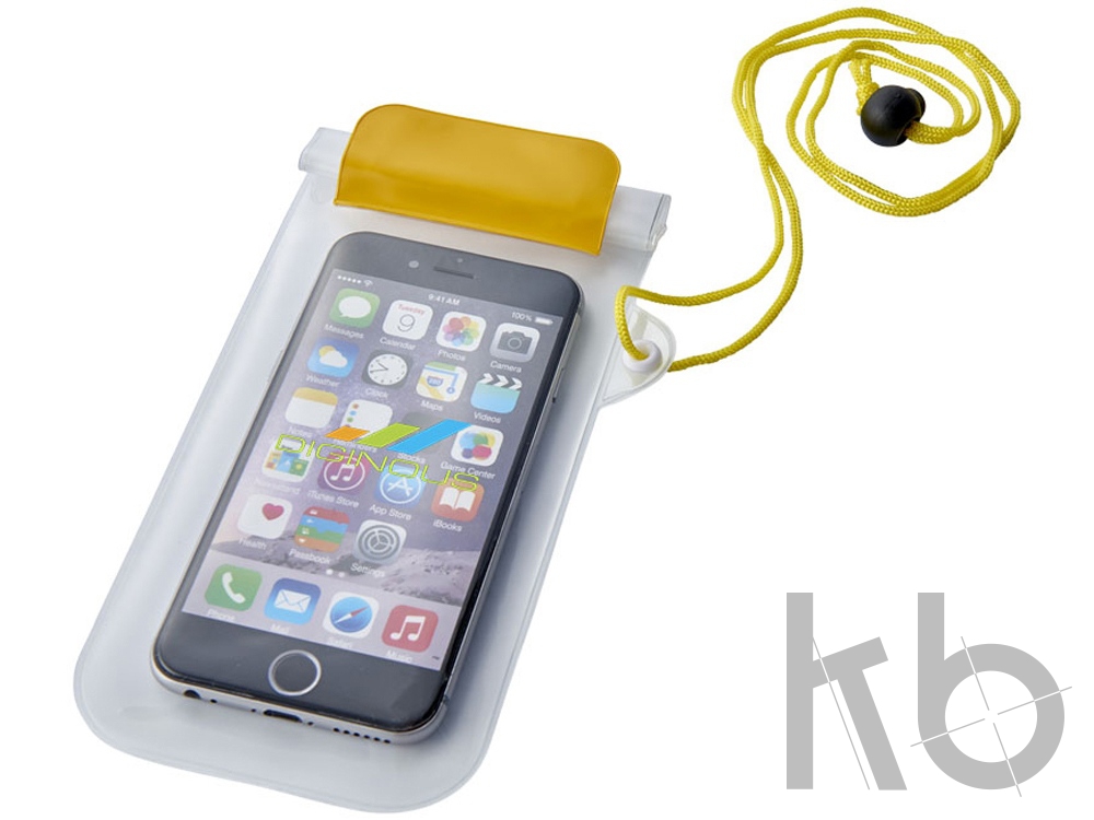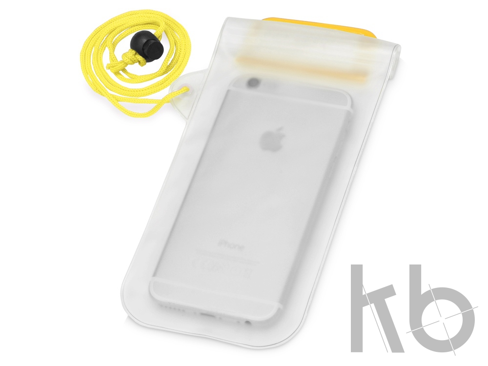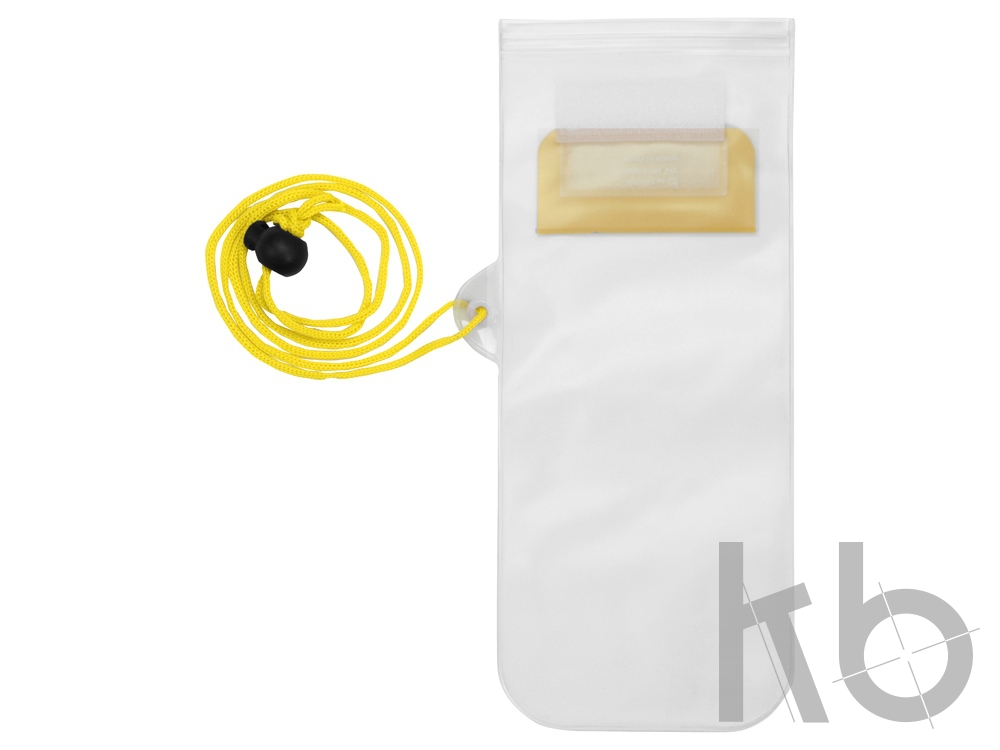 Влагостойкий чехол Mambo. Чехол с матовой прозрачной задней панелью, прозрачным окном для тач скринов спереди, замком - застежкой и цветным клапаном на застежке-липучке. Шнурок на шею с кулиской высотой 50 см. ПВХ.