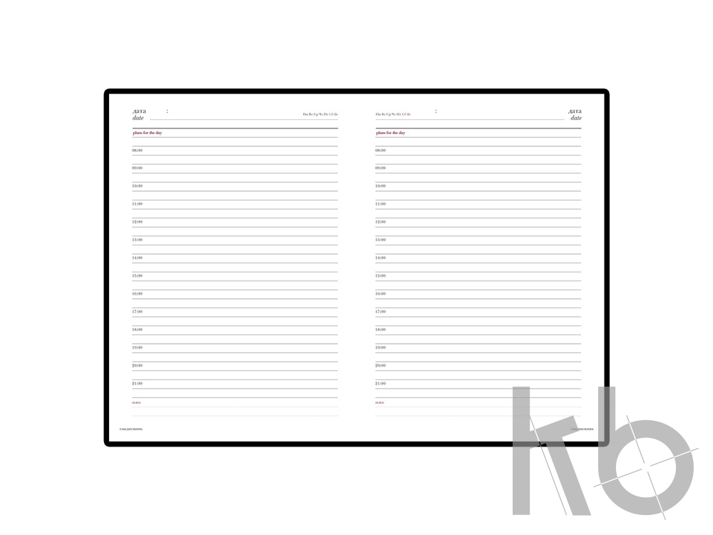 Твердая обложка со слегка закругленными уголками выполнена из гладкого переплетного материала с приятной на ощупь поверхностью soft-touch. По контуру обложки проходит строчка, делающая акцент на форме ежедневника. Благодаря внутреннему набивному слою обложка выглядит объемнее и привлекательнее.