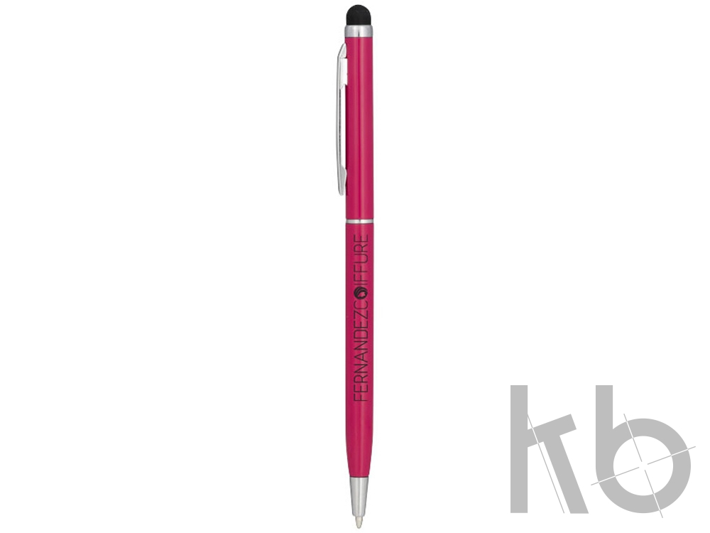 Алюминиевая шариковая ручка Joyce. Тонкая алюминиевая шариковая ручка с поворотным механизмом и стилусом. Алюминиевый корпус с металлическим зажимом и кольцом посередине, остальные элементы из пластика.