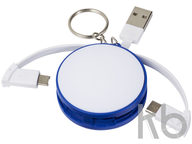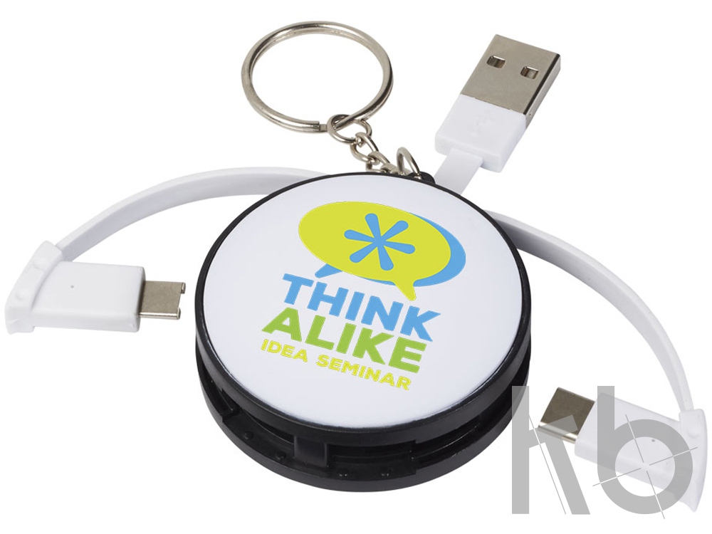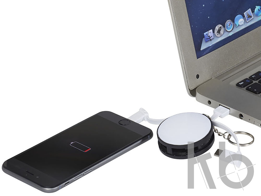 Зарядный кабель 3-в-1. Зарядный кабель 3-в-1 состоит из USB-шнура типа A, высокоскоростного шнура типа C и коннектора, который подходит для устройств iOS и Android. Для хранения кабель можно обернуть вокруг устройства. Поставляется с цепочкой для удобного ношения. Устройства на базе iOS заряжаются стороной без штырьков, устройства на базе Android — стороной со штырьками. ABS пластик.