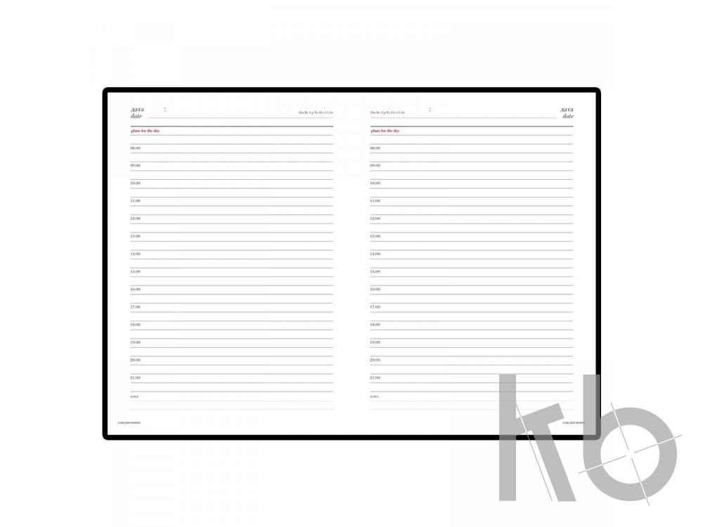 В ежедневнике «Sidney Nebraska» есть полезная справочная информация и телефонная книга на 18 листов, а также 272 страницы для записи идей, мыслей и составления рабочих планов. Для изготовления страниц используется качественный бежевый офсет повышенной плотности (70 г/кв м), который производится в Японии и подходит для всех видов чернил. Разметка блока с указанием времени позволяет планировать дела с точностью до 1 часа.