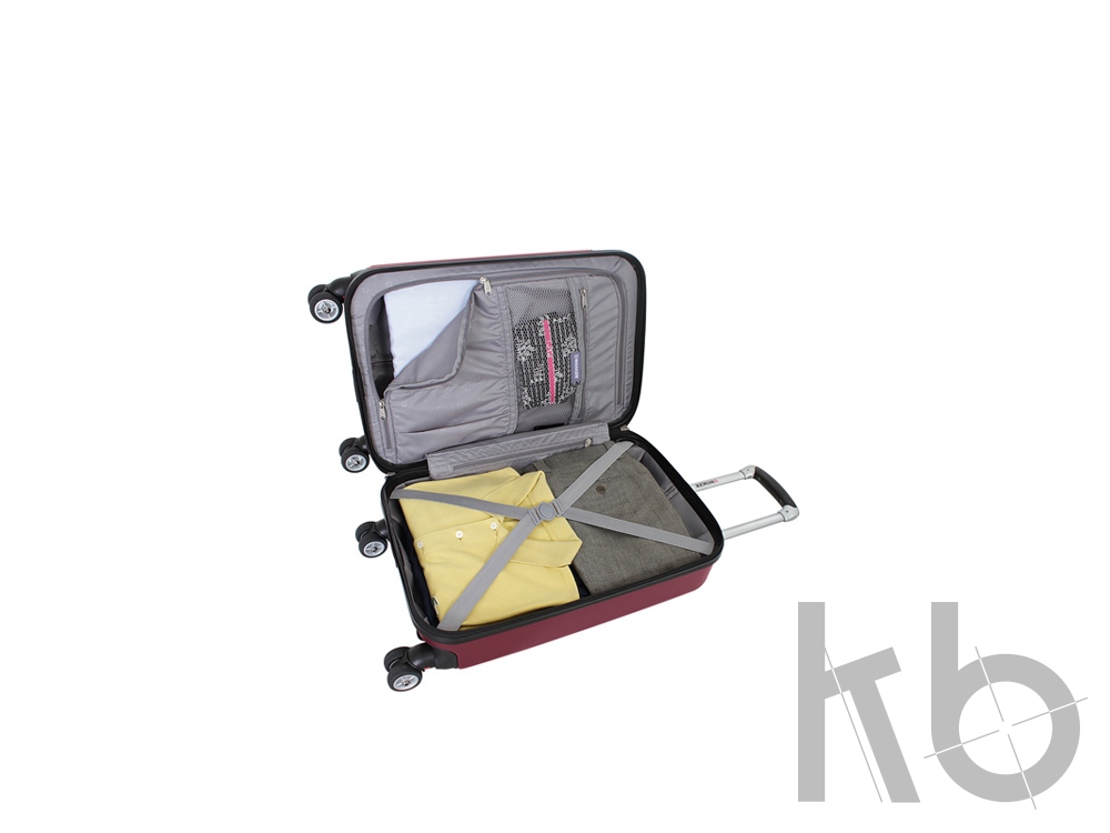 Чемодан полностью раскрывается на 2 вместительных отделения: для основных вещей – нижний, с х-образной резинкой-фиксатором и верхний на молнии, с сетчатым карманом на молнии, двумя карманами на резинке, а так же предусмотрен карман на молнии для мелких вещей.