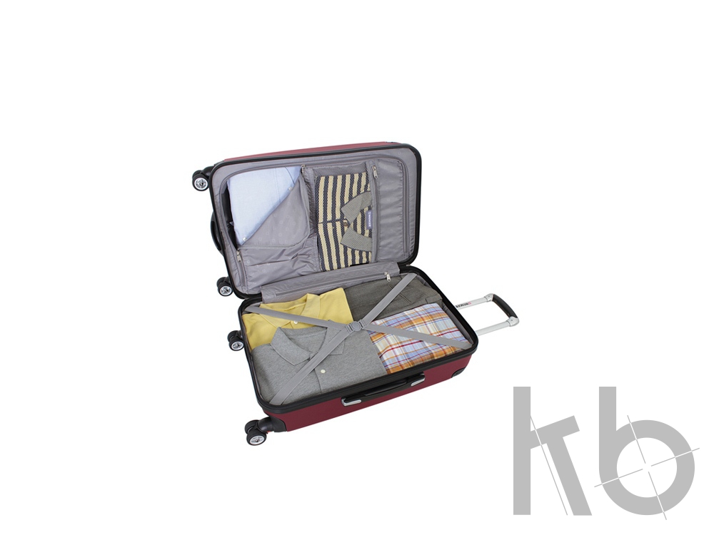 Чемодан полностью раскрывается на 2 вместительных отделения: для основных вещей – нижний, с х-образной резинкой-фиксатором и верхний на молнии, с сетчатым карманом на молнии, двумя карманами на резинке, а так же предусмотрен карман на молнии для мелких вещей.