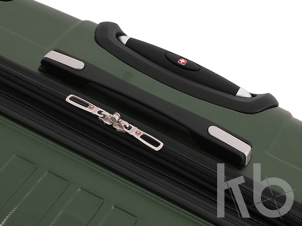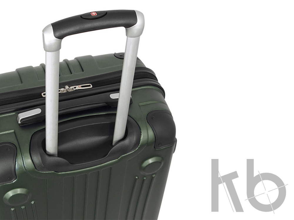 Телескопическая выдвижная алюминиевая ручка с функцией фиксации складывается в специальный отсек. Для комфорта при транспортировке сверху и сбоку чемодана расположены внешние усиленные ручки из формованной резины, что позволяет легко поднимать и перемещать чемодан.