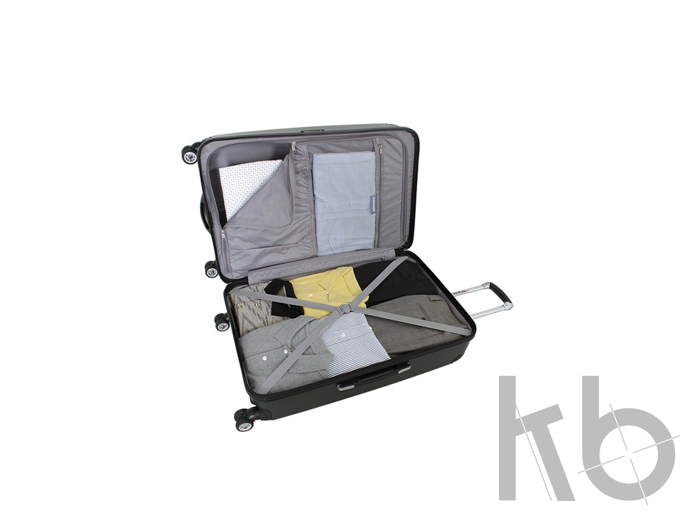 Чемодан полностью раскрывается на 2 вместительных отделения: для основных вещей – нижний, с х-образной резинкой-фиксатором и верхний на молнии, с сетчатым карманом на молнии, двумя карманами на резинке, а так же предусмотрен карман на молнии для мелких вещей.