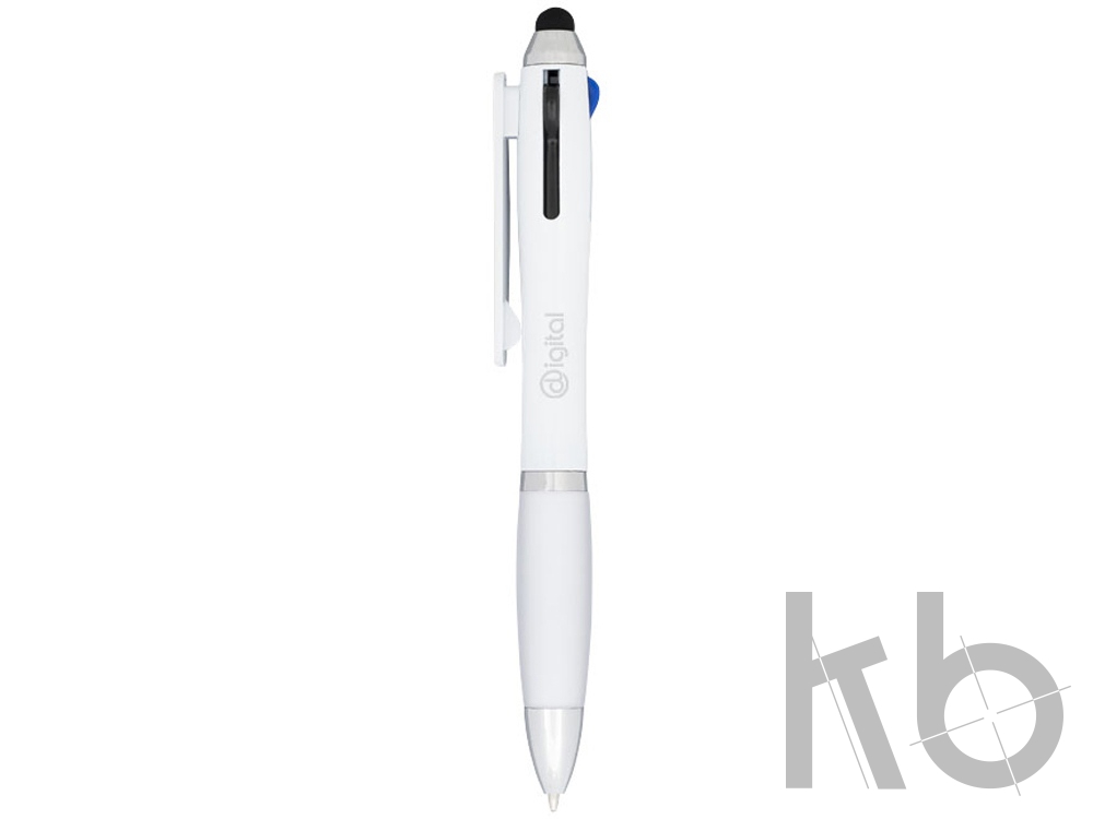 Шариковая ручка Nash «4 в 1». Шариковая ручка Nash с белым корпусом и цветным захватом и зажимом. Четыре функции в одной отличной ручке; красные, черные и синие чернила и стилус. Шариковая ручка с кнопочным механизмом и мягким держателем. АБС-пластик.