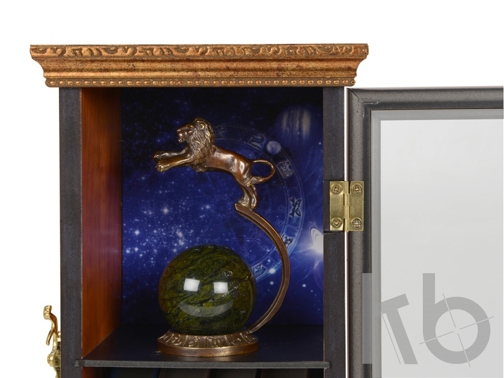 шкаф- пластик/стекло/багетный профиль, знак зодиака- бронза патинированная, змеевик |