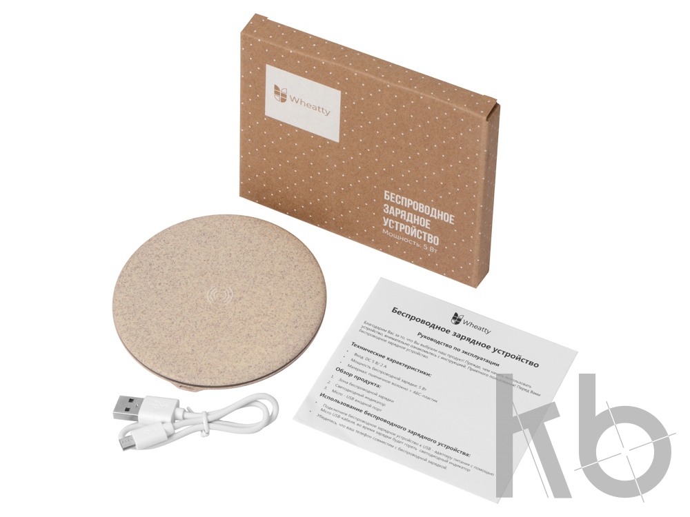 Беспроводное зарядное устройство "Wheatty" на 35% состоит из переработанной пшеничной соломы, что является положительным примером сокращения производства и потребления пластика в мире. Чтобы зарядить смартфон, просто подключите беспроводную зарядку к любому порту USB, используя кабель из комплекта, и положите свой смартфон на нее. Смартфон должен поддерживать функцию беспроводной зарядки. Мощность беспроводной зарядки 5 Вт. Благодаря небольшим размерам практически не занимает места. Поставляется в крафт упаковке из переработанной бумаги.