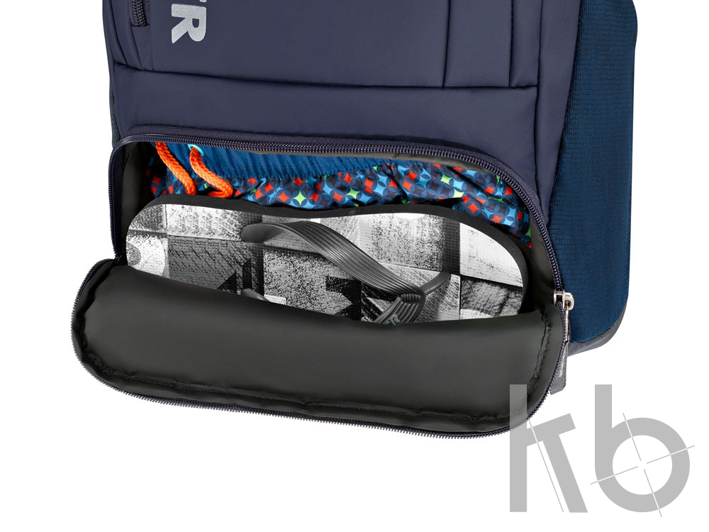 - Карман для мокрых вещей: Специальный карман в нижней части рюкзака для плавок, шлепанцев и прочих мокрых вещей.