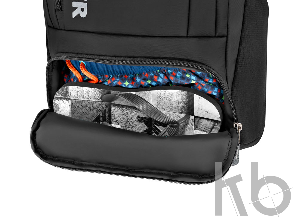 - Карман для мокрых вещей: Специальный карман в нижней части рюкзака для плавок, шлепанцев и прочих мокрых вещей.