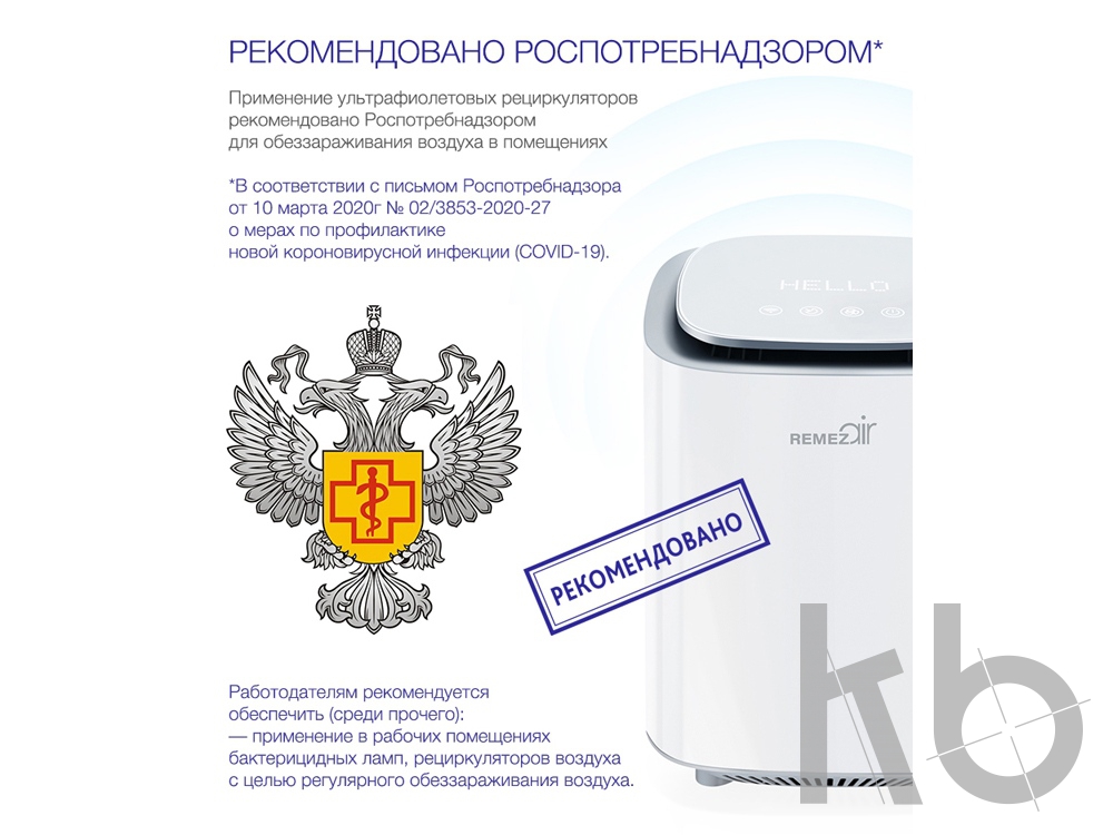 Благодаря использованию УФ-технологии инновационный прибор REMEZair уничтожает до 99,95% всех известных вирусов и бактерий (вкл. COVID), делая воздух чистым и безопасным.