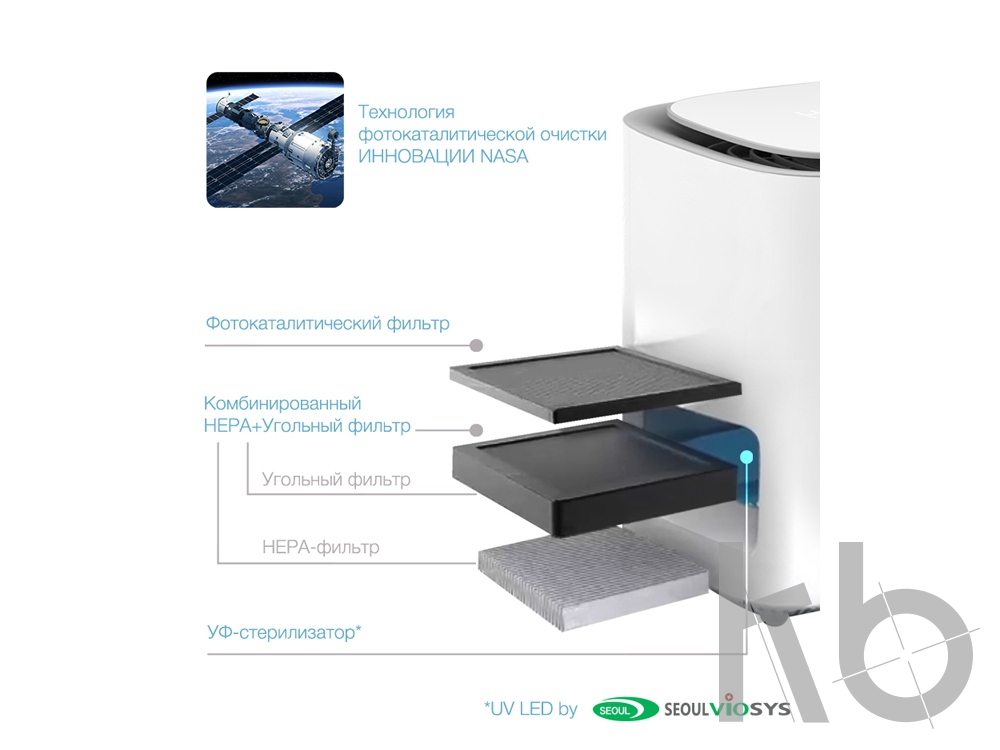 Многоступенчатая система фильтрации устраняет из воздуха (пыльцу, шерсть и перхоть животных, пыль и споры плесени), поглощает запахи, формальдегиды и прочие летучие органические соединения.