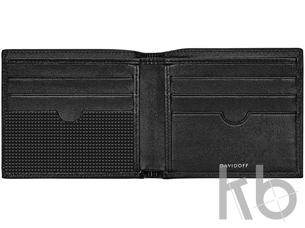Бумажник от швейцарского бренда Davidoff из коллекции Paris выполнен из натуральной телячьей кожи черного цвета. Дизайн вдохновлен разнообразием Парижа, тиснение на коже в виде мелкого квадрата, напоминающего профиль городских тротуаров, обрезанные, лакированные края придают аксессуару современный, спортивный стиль. Полуанилиновая обработка обеспечивает кожу лучшими водоотталкивающими свойствами. Состоит из 2 отделений для купюр и 6 для кредитных карт. Логотип Davidoff с тиснением на передней части и принт логотипа во внутренней части бумажника подчеркивает статусность и подлинность аксессуара. размер - 11,5*9,5*1 см. Гарантия 1 год.