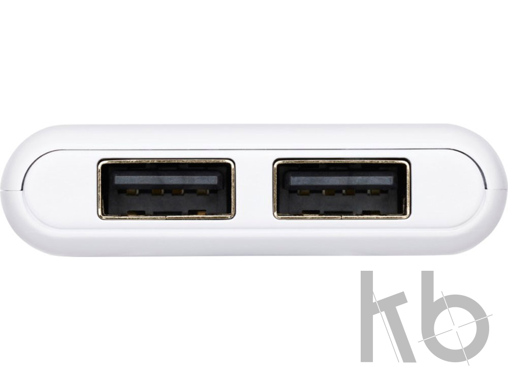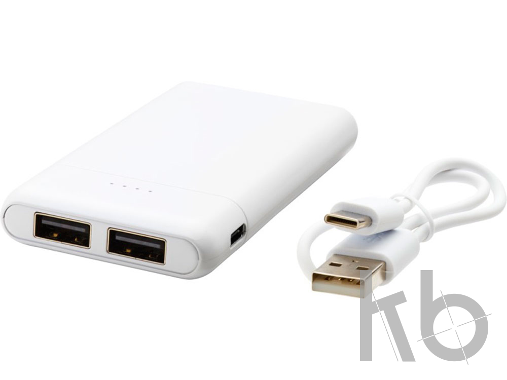Карманное портативное зарядное устройство с аккумулятором высокой плотности емкостью 5000 мАч. Вход Тип-C (5 V/2 А) и двойной выход USB-A (5 V/2 А). В комплект входит кабель для зарядки из TPE-пластика без ПВХ.