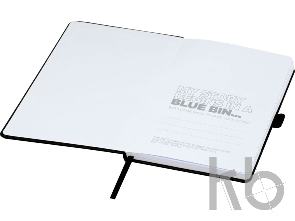Блокнот формата А5 с обложкой из переработанного ПЭТ. Содержит 80 листов в линию плотностью 70 г/м², изготовленных из переработанной бумаги, с петлей для ручки и лентой-закладкой. Может быть дополнен шариковой ручкой Honua 107757 из переработанного ПЭТ. Переработанный PET пластик.