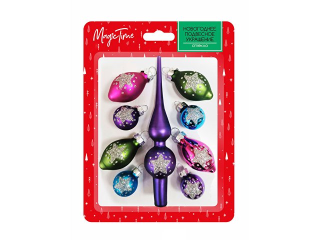 Елочный набор из коллекции Magic Time - классический вариант для украшения вашей новогодней ели. Елочные игрушки насыщенных цветов из стекла будут идеально сочетаться с зелеными хвойными ветвями. В наборе игрушек присутствует верхушка для елки, которая дарит приятное ощущение уютного и доброго праздника. Такой набор можно использовать как дополнение к композиции, так и как основной элемент ели. Также он послужит идеальным подарком для ваших близких и родных. Каждый набор упакован в индивидуальный блистер.