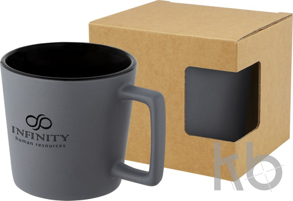 Керамическая кружка с современным дизайном и матовой отделкой. Объем 370 мл. Можно мыть в посудомоечной машине (все способы декорирования). Поставляется в подарочной коробке из переработанного картона. Керамика.