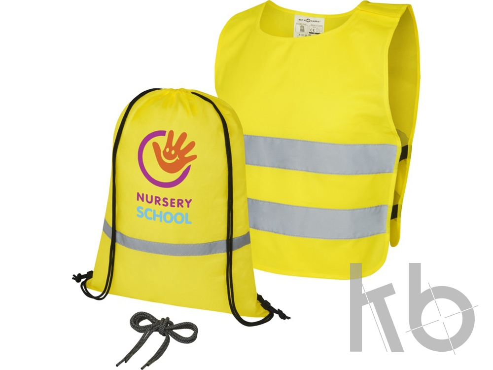 Этот подарочный комплект состоит из светоотражающего рюкзака со шнурком, защитного жилета и комплекта светоотражающих шнурков.
