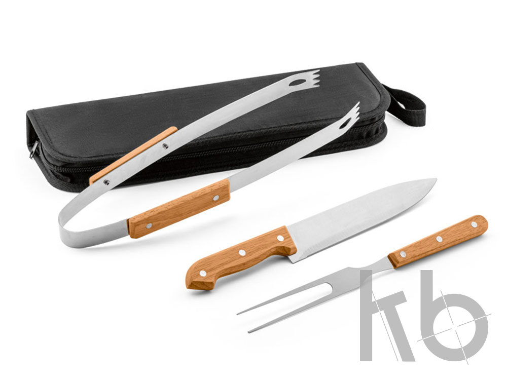 Набор из 3 предметов для барбекю из дерева и нержавеющей стали. Набор из 3 предметов в жестком футляре 210D. Сумка: 350 x 230 x 40 мм. Вид нанесения, рекомендуемый поставщиком: гравировка, трансфер.