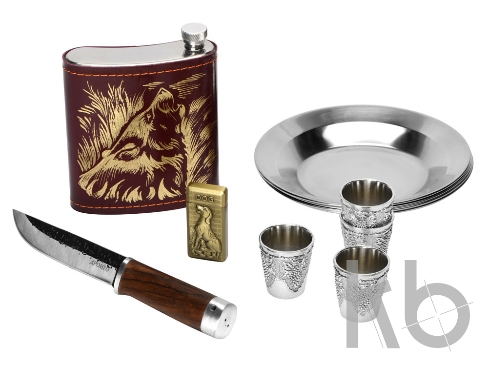 | Комплектность | тарелка d18,3 х 2,5 см - 4шт, нож 23,5 х 3 х 2,3 см, зажигалка 3,3 х 6,7 х 1,2 см, стопка d4,3 х 4,9 см - 4шт, фляга 12,7 х 16 х 4 см |