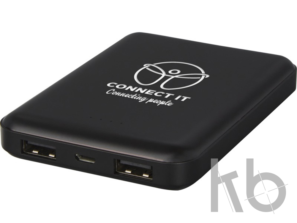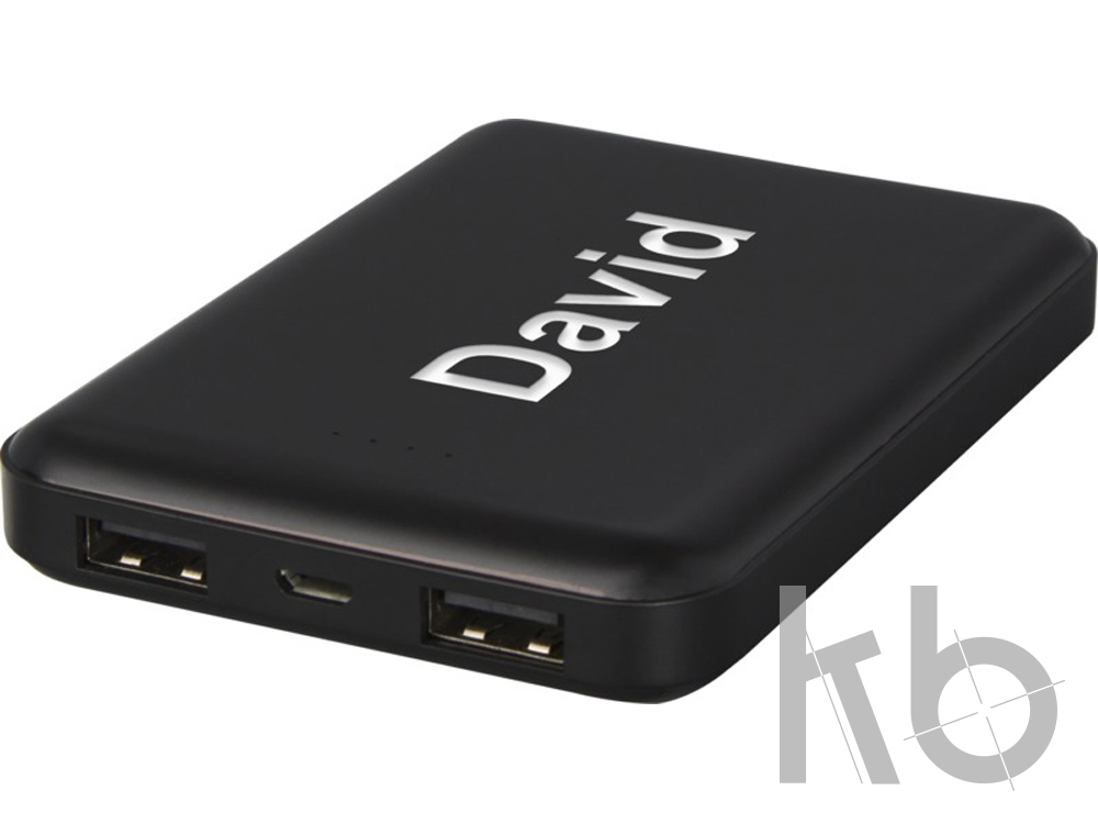 Плоское и надежное портативное зарядное устройство с полимерным аккумулятором емкостью 5000 мАч. На переднюю панель можно нанести лазерную гравировку, которая при включении портативного зарядного устройства или его использовании будет подсвечивать логотип. Выходная мощность: 5 В/2 А. Входная мощность: 5 В/2 А. Для обеспечения устойчивости вспомогательные кабели не предусмотрены.