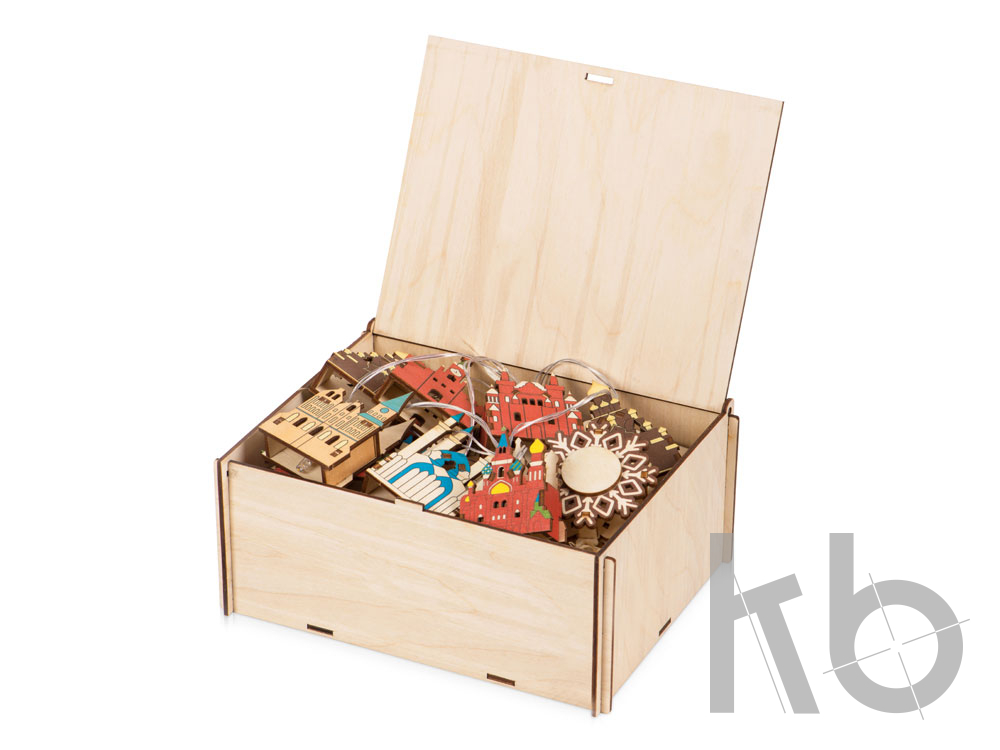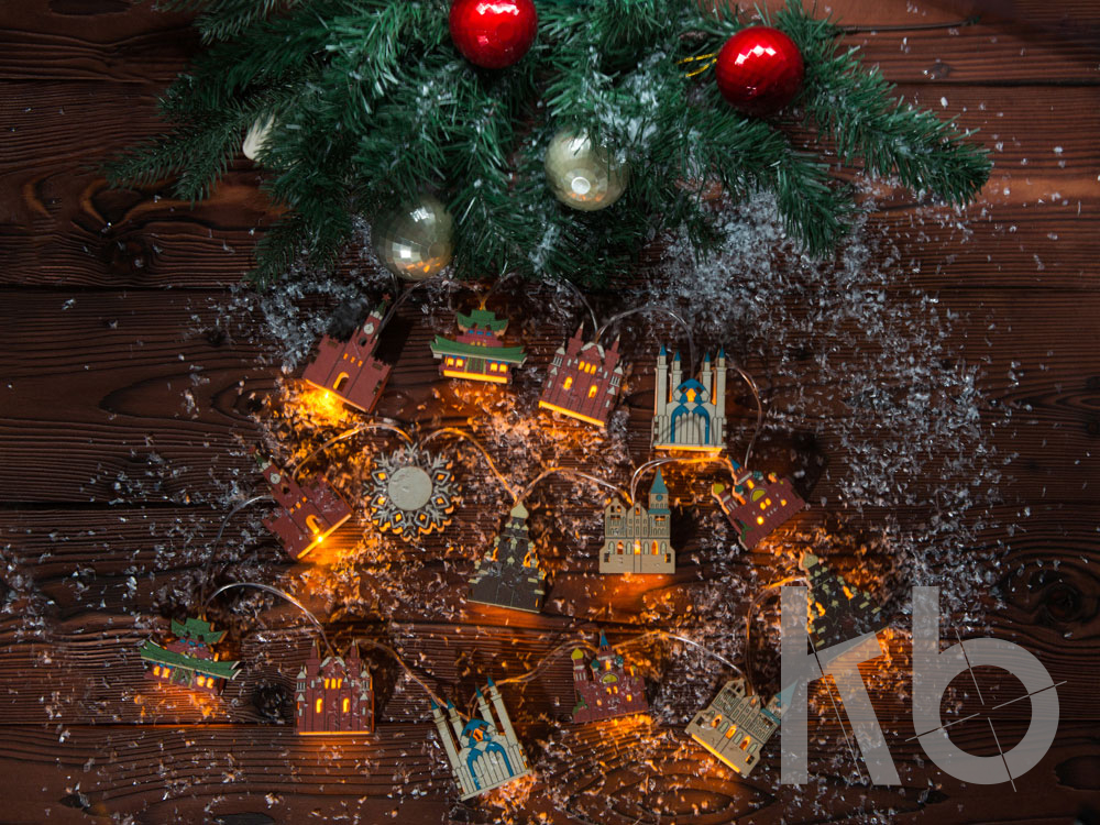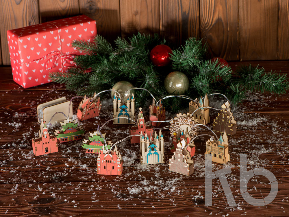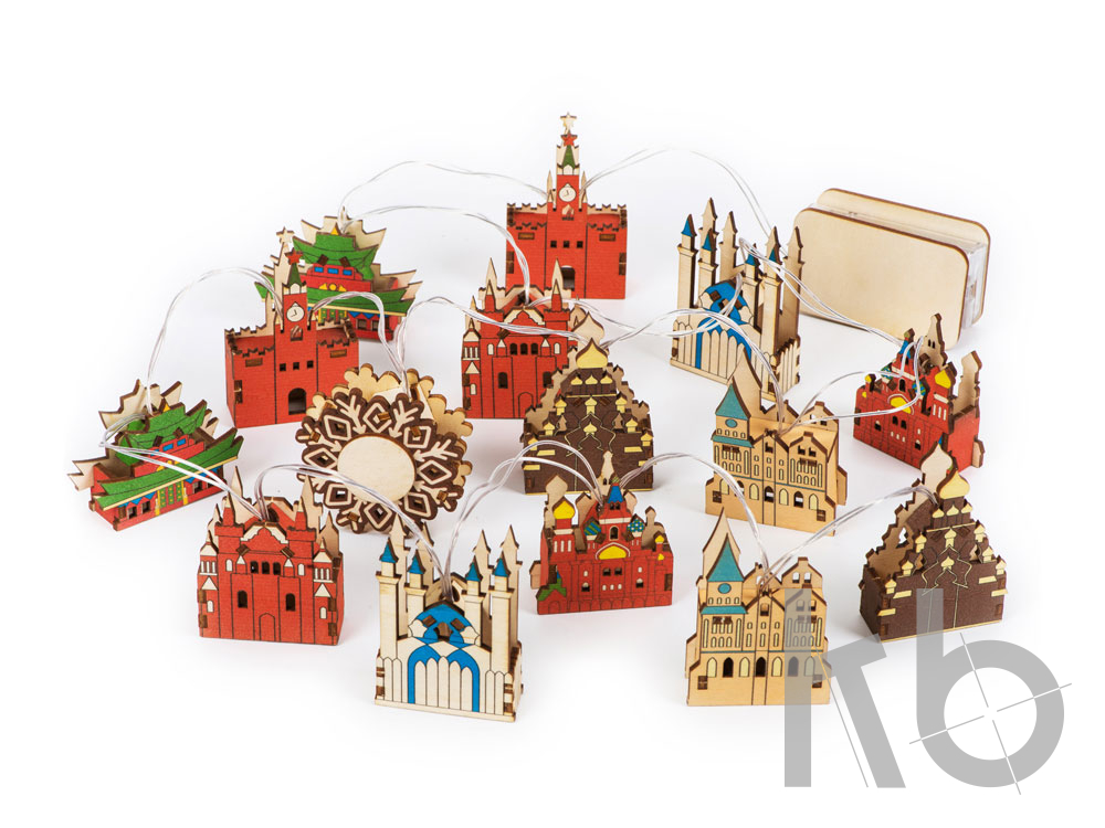 Новогодняя ёлочная гирлянда постоянного свечения с цветными фигурками достопримечательностей из натуральной березовой фанеры в подарочной коробке сделает процесс украшения ёлки или дома не только увлекательным, но и познавательным! Гирлянда состоит из 7 парных фигурок достопримечательностей и центрального элемента в виде снежинки. Снежинка и корпус батарейного блока имеют дополнительные съемные панели, которые поставляются в наборе в виде отдельных деталей и крепятся на изделие на двусторонний скотч. Эти элементы, а также подарочная коробка из экологически чистой фанеры, специально предназначены для нанесения и придания презенту уникальности. Гирлянда работает от 2-х батареек АА, которые входят в комплект.