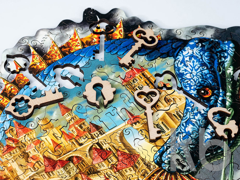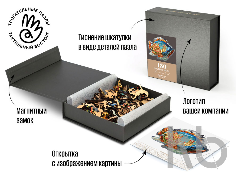 Необычный пазл, который приведет в восторг даже искушенных любителей такого рода головоломок. Некоторые детали этого пазла выполнены в форме фигурок, тематически связанных с изображением — а найти эти символы вам предстоит самостоятельно. Еще один плюс этого набора — его материал: каждый элемент выполнен из дерева, что делает процесс сборки пазла тактильно приятным. Фигурки прочные, толщина каждой — 5+ мм, поэтому разбирать и собирать изображение можно без страха за соединяющие пазы. Пазл в собранном виде может украсить интерьер квартиры или офиса, стать предметом декора. Головоломка поставляется в сером футляре из дизайнерского картона с магнитным замком, который можно брендировать вашим логотипом. Крышка футляра снабжена наклейкой с изображением картины для облегчения сборки. - необычный подарок - фигурные детали в виде ключей, замков и элементов подводного мира - выполнен из дерева - можно брендировать упаковку - 130 деталей - размер собранной картины 31 х 24 см