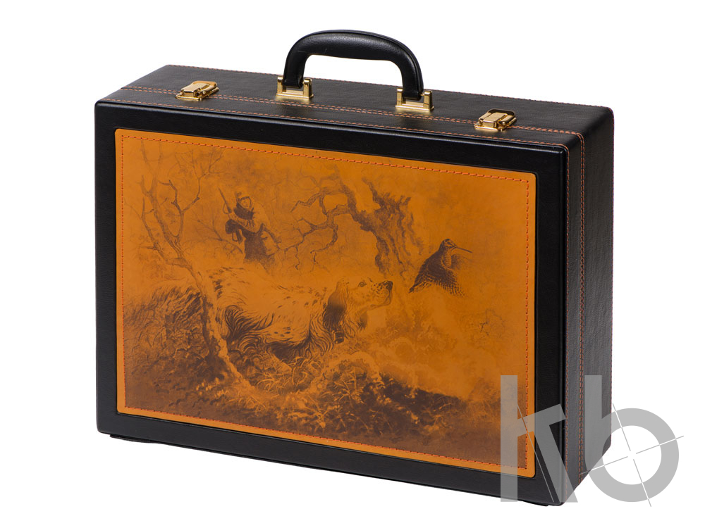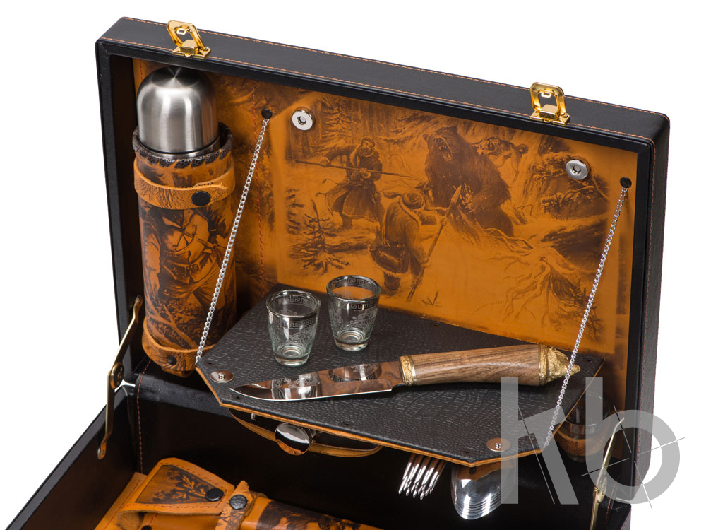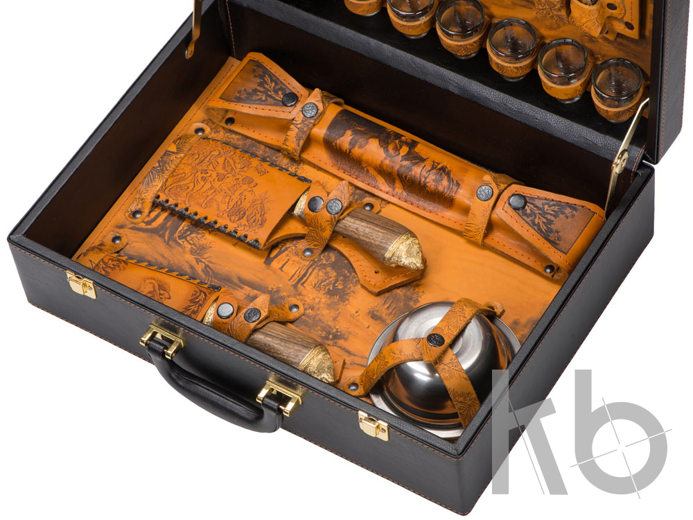 Набор "Охотничий азарт". Каждый кейс изготовлен из натуральной кожи. На наружных сторонах имеется свой уникальный авторский рисунок, выполненный в технике художественного выжигания. Внутренние элементы также отделаны натуральной кожей, которая различается по цветовым решениям. Остальные предметы подарочного набора изготовлены из высококачественной нержавеющей стали. Этот подарок идеально подойдет для настоящих мужчин с характером! В комплект входит: Фляга 480мл (нерж. сталь)– 1шт. Стопка 40мл (стекло)– 6 шт. Ложка столовая "Тройка" (нерж. сталь)– 6 шт. Вилка столовая "Тройка" (нерж. сталь)– 6 шт. Нож "Тяпка" с головой нерж. сталь 45х13, рукоять орех, бронзовое литье, в чехле с художественным выжиганием– 1 шт. Нож разделочный (нерж. сталь) 45х13 в чехле с художественным выжиганием, рукоять орех, бронзовое литье– 1 шт. Термос 0.33 л. (нерж. сталь) в чехле с художественным выжиганием – 1 шт. Мангал 350 мм (нерж. сталь) в чехле с художественным выжиганием– 1 шт. Шампура 350 мм (нерж. сталь)– 6 шт. Тарелка (нерж. сталь)– 6 шт.