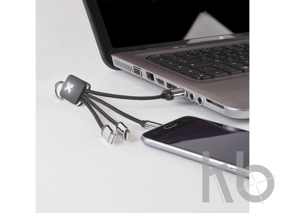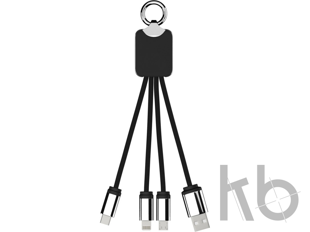 Кабель с soft-touch и металлическим покрытием, а также светящимся логотипом, оснащен тремя разъемами для зарядки (тип C, Android, iPhone). Можно заряжать до трех устройств одновременно. Длина кабелей (со штекерами): 10 см. Упаковка изготовлена из бумаги и пластика вторичной переработки.