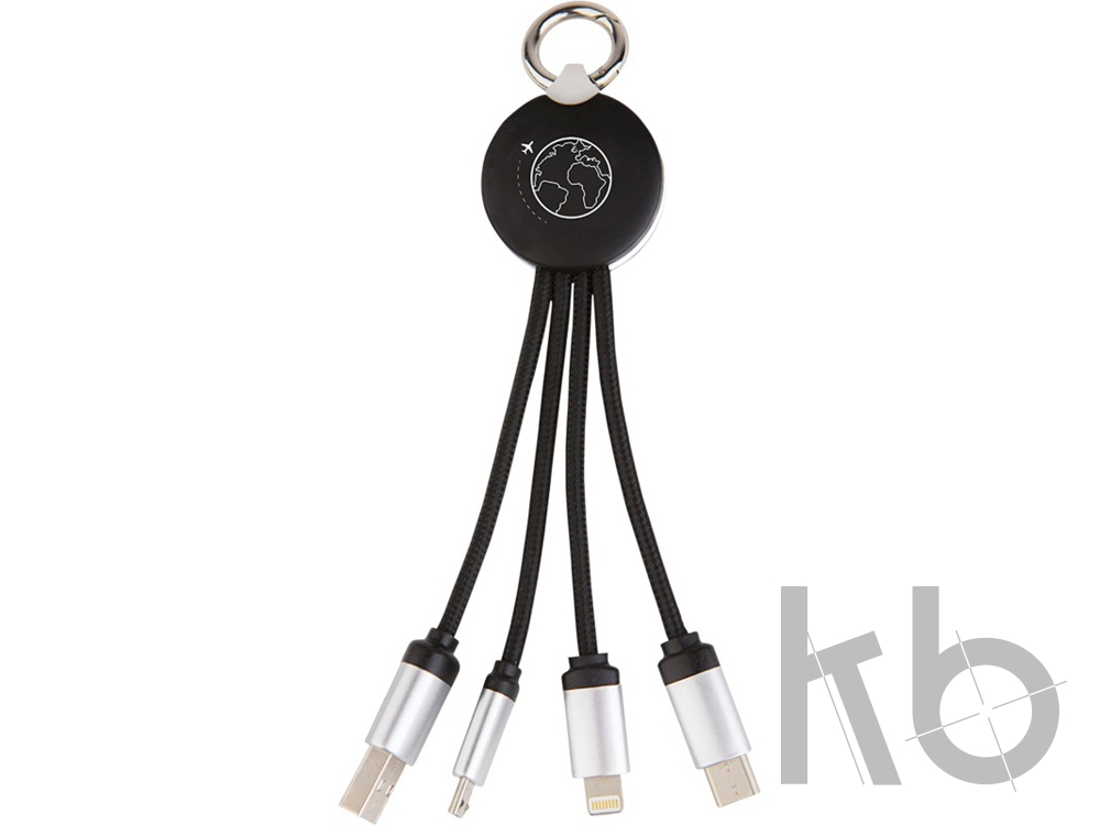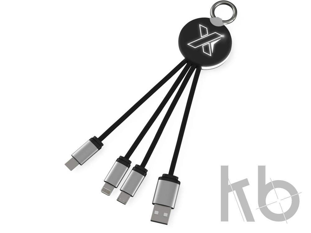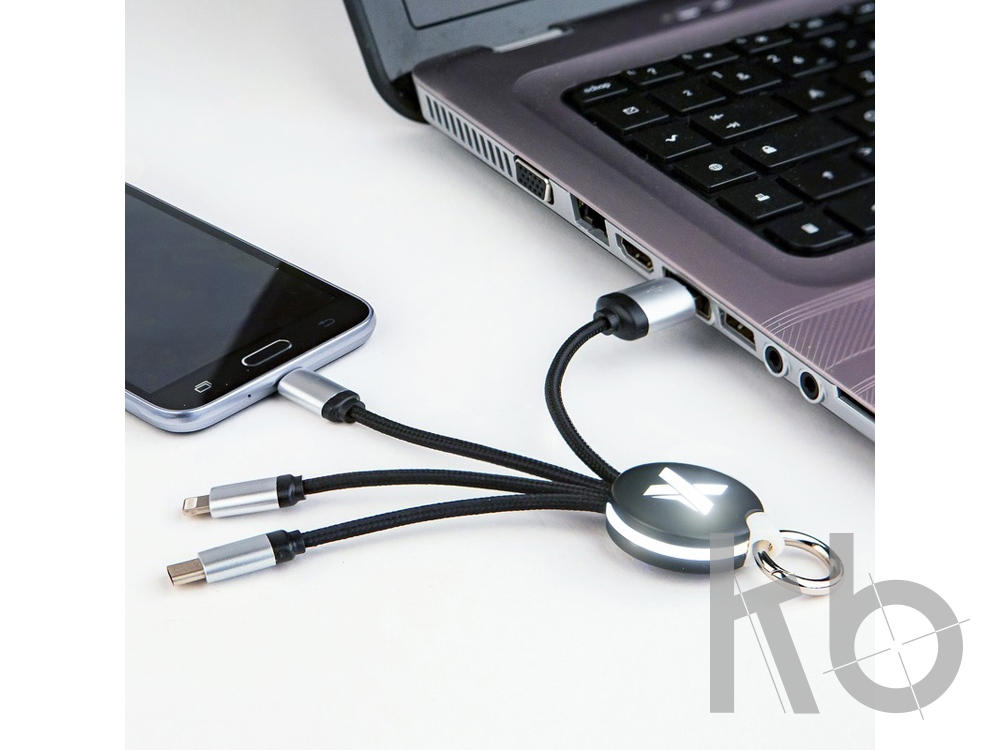 Кабель с soft-touch и металлическим покрытием, а также светящимся логотипом, оснащен тремя разъемами для зарядки (тип C, Android, iPhone). Можно заряжать до трех устройств одновременно. Длина кабелей (со штекерами): 10 см. Упаковка изготовлена из бумаги и пластика вторичной переработки.