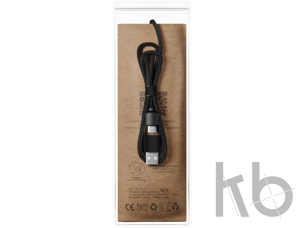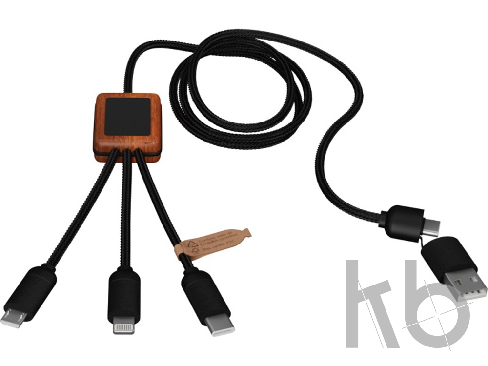 Зарядный кабель 3 в 1 из переработанного PET-пластика со светящимся логотипом и квадратным бамбуковым корпусом. Светящийся логотип виден с обеих сторон. Имеет 3 разъема (type C, micro USB, iPhone) и двойной разъем USB для универсального использования. Поставляется в сумке TPU с карточкой из крафт-бумаги. Длина кабеля: 1 метр. Гарантия 3 года.