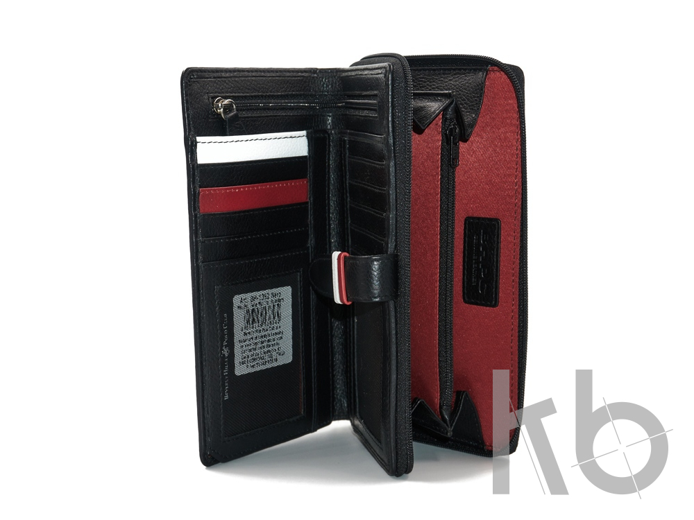 Описание внутри: 1-е основное отделение на молнии, внутри которого 2 отделения для купюр, 1 отделение на молнии; 2-е основное отделение, внутри которого 10 отделений для карт;