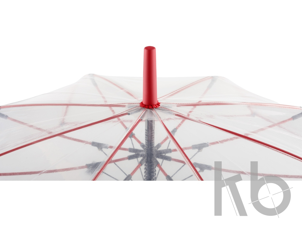 Зонт-трость с прозрачным куполом и контрастными деталями легко открывается нажатием кнопки на ручке. Каркас выполнен из прочной долговечной гальванизированной стали. Благодаря гибким спицам из стекловолокна зонту не страшны порывы ветра.
