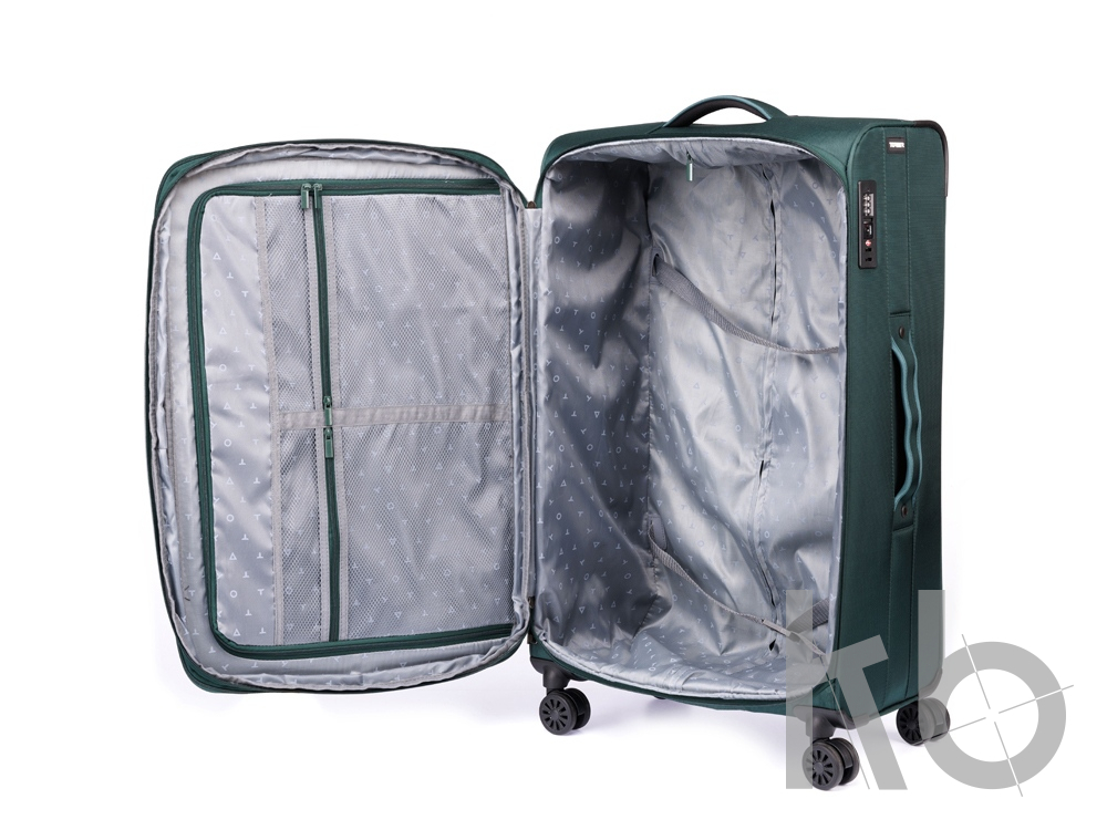 Чемодан полностью раскрывается на 2 отделения, с перегородкой на молнии и ремнями для надежной фиксации вещей на месте.