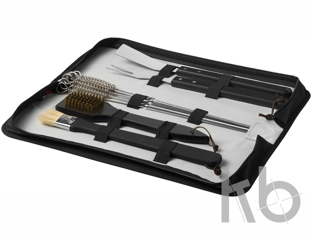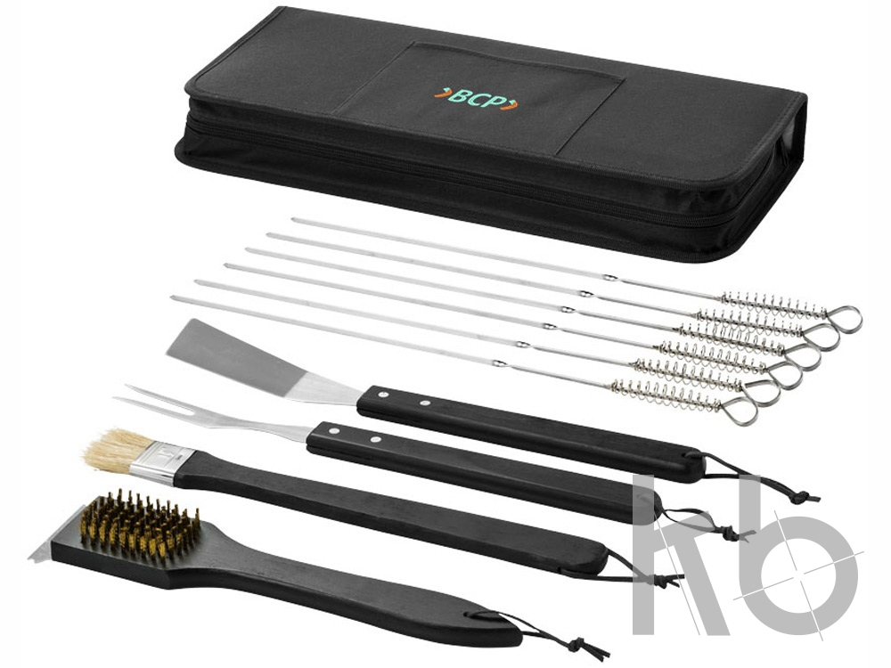 Набор для барбекю "Asado" из 11 предметов. Набор для барбекю включает лопатку для рыбы, кисть, вилку и щетку для очистки с деревянными ручками, шесть шампуров и чехол на молнии с передним карманом для нанесения. Нанесение не предлагается на отдельные элементы набора. Нержавеющая сталь и полиэстер 600D.