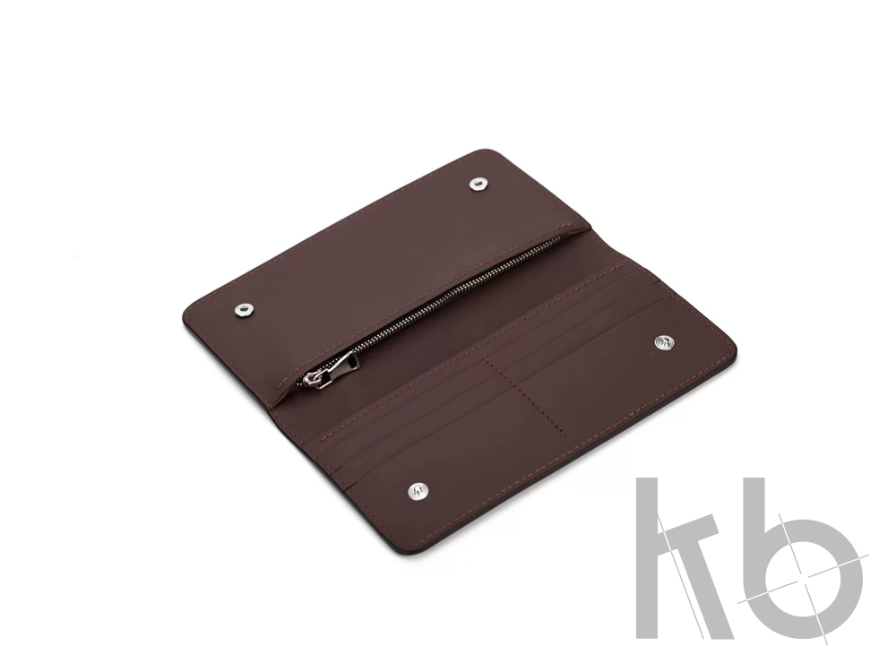 Внутри бумажника есть отделения для карт, купюр и широкое отделение, застегивающееся на молнию. Бумажник закрывается на кнопки, это сделано для того, чтобы он оставался закрытым где бы вы его не носили. Края бумажника окрашены в ручную.