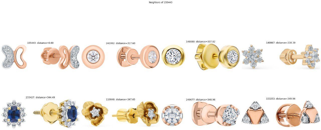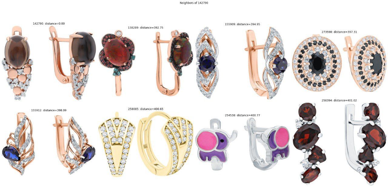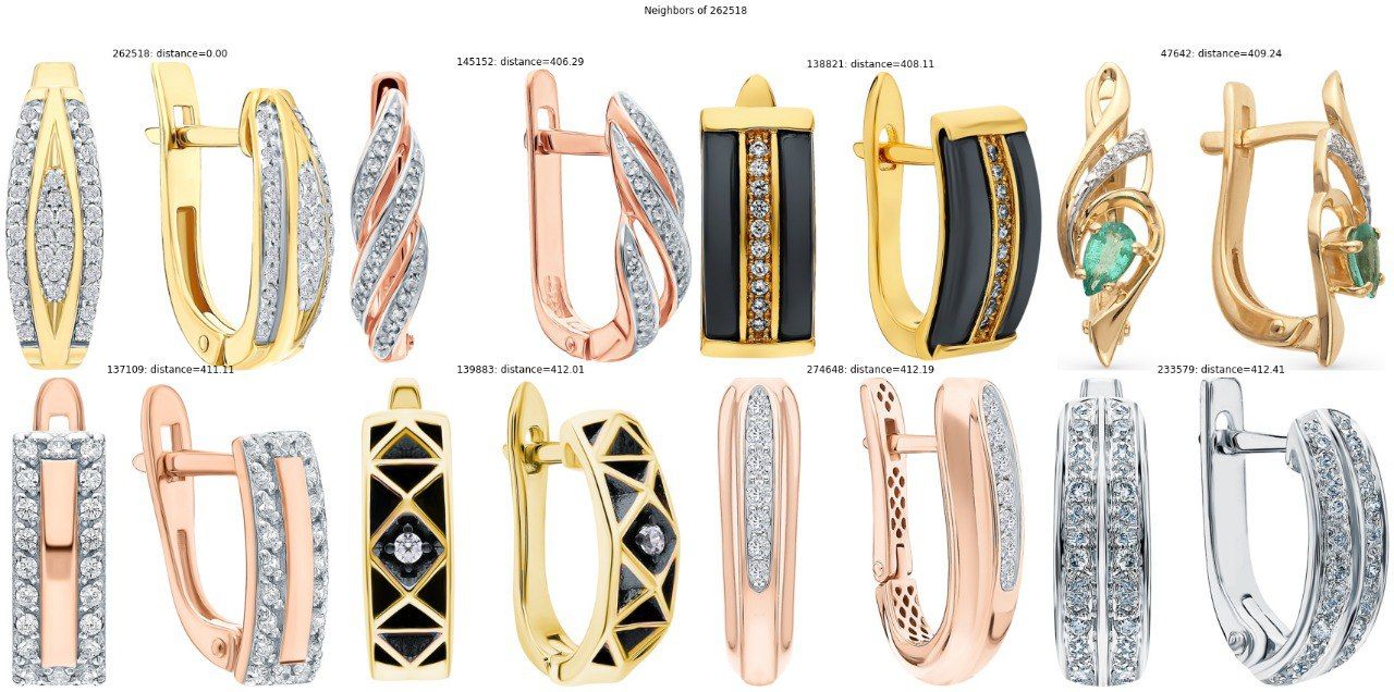 На изображениях приведены примеры ближайших соседей, рассчитанных на 5 000 эмбеддингах EfficientNet-B0 высокой размерности. Соседи ближайшие по отношению к верхнему левому изображению.